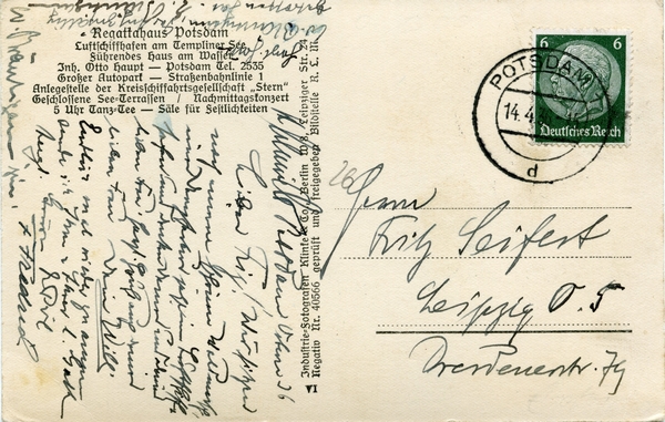 Text auf der Karte: Potsdam-Sportplatz, Luftschiffhafen. Regattahaus rückseitig: Inh. Otto Haupt - Potsdam Tel. 2535 Entstehungszeit der Karte: gestempelt Potsdam 14.04.1936 Straße und Hausnummer: Am Templiner See Kartenart: Ansichtskarte Kartentechnik: SW-Foto Verlag: Industrie=Fotografen Klinke & Co., Berlin W 8, Leipziger Str. 24 Gelaufen/ungelaufen: gelaufen Zustand (I=sehr gut bis V=mangelhaft): I Häufigkeit (h=häufig bis rrr=sehr selten): h Heutige(r) Straßenname(n): Am Luftschiffhafen Kommentar: 1925 erfolgt die Anlage des "Land- und Wassersportplatzes Luftschiffhafen".