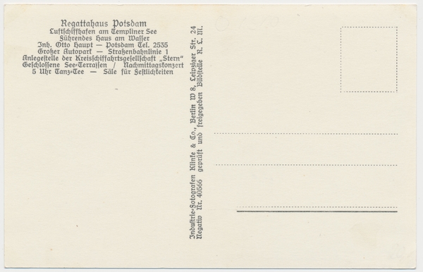 Text auf der Karte: Potsdam-Sportplatz Luftschiffhaben, Regattahaus Entstehungszeit der Karte: ca. 1935 Straße und Hausnummer: Am Templiner See Kartenart: Ansichtskarte Kartentechnik: SW-Foto Verlag: Industrie=Fotografen Klinke & Co., Berlin W 8, Leipziger Str. 24 Gelaufen/ungelaufen: ungelaufen Zustand (I=sehr gut bis V=mangelhaft): I Häufigkeit (h=häufig bis rrr=sehr selten): h Heutige(r) Straßenname(n): Am Luftschiffhafen Kommentar: 1925 erfolgt die Anlage des "Land- und Wassersportplatzes Luftschiffhafen".