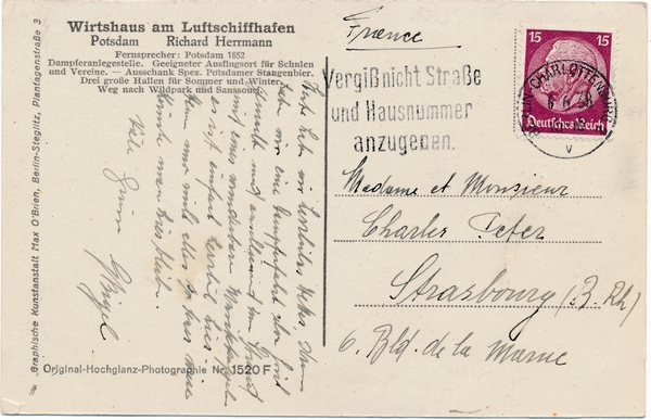 Text auf der Karte: Wirtshaus am Luftschiffhafen, Strandbad Potsdam (Original-Fliegeraufnahme) Entstehungszeit der Karte: gestempelt Berlin Charlottenburg 06.06.1938 Straße und Hausnummer: Am Templiner See Kartenart: Ansichtskarte Kartentechnik: SW-Foto Verlag: Graphische Kunstanstalt Max O'Brien, Berlin-Steglitz, Plantagenstraße 3 Gelaufen/ungelaufen: gelaufen Zustand (I=sehr gut bis V=mangelhaft): II Häufigkeit (h=häufig bis rrr=sehr selten): h Heutige(r) Straßenname(n): Am Luftschiffhafen Kommentar: 1925 erfolgt die Anlage des "Land- und Wassersportplatzes Luftschiffhafen".