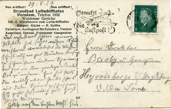 Text auf der Karte: Potsdam Strandbad Luftschiffhafen rückseitig: neu eröffnet Strandbad Luftschiffhafen Potsdam, Telefon 1852 Waldemar Gericke Inh. D. Wirtshauses zum Luftschiffhafen Entstehungszeit der Karte: gestempelt 30.08.1929 Straße und Hausnummer: Zeppelinstraße Kartenart: Ansichtskarte Kartentechnik: Kupfertiefdruck Verlag: Foto u. Verlag Max Hochgeladen, Potsdam 927 Gelaufen/ungelaufen: gelaufen Zustand (I=sehr gut bis V=mangelhaft): II Häufigkeit (h=häufig bis rrr=sehr selten): r Heutige(r) Straßenname(n): Zeppelinstraße (Potsdam-West) Kommentar: 1925 erfolgt die Anlage des "Land- und Wassersportplatzes Luftschiffhafen".