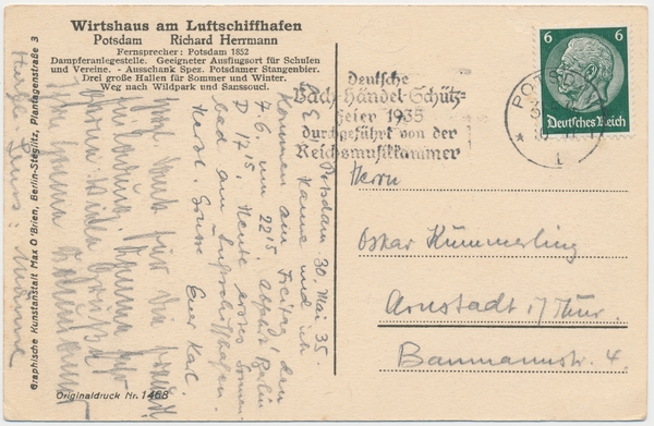 Text auf der Karte: Partie am Luftschiffhafen Potsdam, am Templiner See. Entstehungszeit der Karte: gestempelt Potsdam 30.05.1935 Straße und Hausnummer: Am Templiner See Kartenart: Ansichtskarte Kartentechnik: Kupfertiefdruck Verlag: Graphische Kunstanstalt Max O'Brien, Berlin-Steglitz, Plantagenstraße 3 Gelaufen/ungelaufen: gelaufen Zustand (I=sehr gut bis V=mangelhaft): I Häufigkeit (h=häufig bis rrr=sehr selten): r Heutige(r) Straßenname(n): Am Luftschiffhafen