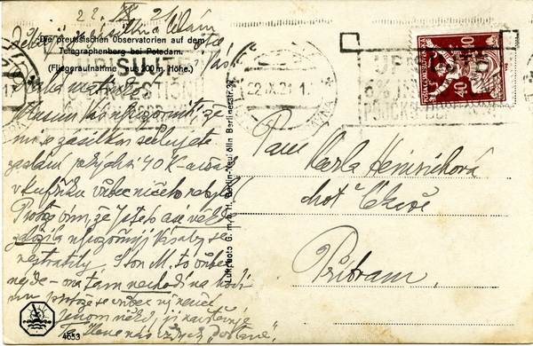 Text auf der Karte: Die preußischen Observatorien auf dem Telegraphenberg bei Potsdam (Fliegeraufnahme aus 200 m Höhe) Entstehungszeit der Karte: gestempelt 22.09.1921 Kartenart: Ansichtskarte Kartentechnik: SW-Foto Verlag: Luftphoto G. m. b. H. Berlin-Neukölln, Berlinerstr. 32 Gelaufen/ungelaufen: gelaufen Zustand (I=sehr gut bis V=mangelhaft): II Häufigkeit (h=häufig bis rrr=sehr selten): h Heutige(r) Straßenname(n): Telegrafenberg