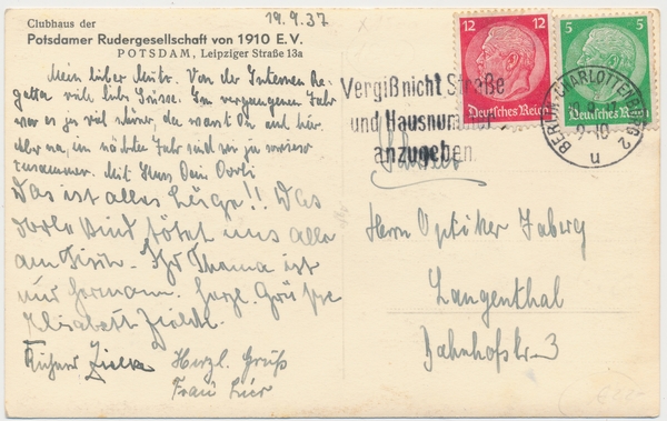 Text auf der Karte: Clubhaus der Potsdamer Rudergesellschaft von 1910 E. V. Entstehungszeit der Karte: gestempelt Berlin-Charlottenburg 20.09.1937 Straße und Hausnummer: Leipziger Straße 13a Kartenart: Ansichtskarte Kartentechnik: SW-Foto Verlag: unbekannt Gelaufen/ungelaufen: gelaufen Zustand (I=sehr gut bis V=mangelhaft): I Häufigkeit (h=häufig bis rrr=sehr selten): r Heutige(r) Straßenname(n): Leipziger Straße Uferweg (Templiner Vorstadt)