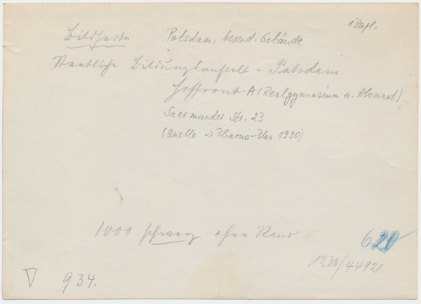 Text auf der Karte: Staatliche Bildungsanstalt Potsdam Hoffront Entstehungszeit der Karte: ca. 1915 Straße und Hausnummer: Saarmunder Straße (heute: Heinrich-Mann-Allee) Kartenart: Ansichtskartenvorlage 13x18 Kartentechnik: SW-Foto Verlag: Max Hochgeladen, Potsdam Gelaufen/ungelaufen: ungelaufen Zustand (I=sehr gut bis V=mangelhaft): I Häufigkeit (h=häufig bis rrr=sehr selten): r Heutige(r) Straßenname(n): Heinrich-Mann-Allee (Teltower Vorstadt) Kommentar: Die Kadettenanstalt war eine Einrichtung für die Vorbereitung von 12- bis 18-jährigen Schülern (Kadetten) auf die Offizierslaufbahn in einem ausgedehnten Gebäudekomplex aus unterschiedlichen Bauzeiten an der Heinrich-Mann-Allee 107. Die 1769 in Stolp in Pommern gegründete Kadettenanstalt wurde 1811 nach Potsdam verlegt und zunächst im Großen Militärwaisenhaus untergebracht. 1823 erhielt die Kadettenanstalt moderne Lehrgebäude an der Heinrich-Mann-Allee 107, die später erweitert und umgebaut wurden. Nach 1918 wurde die Kadettenanstalt geschlossen. Ihre Gebäude unterlagen in der Folgezeit einer vielfältigen Nutzung: 1922 bis ca. 1932 Lehrerbildungsanstalt, 1933 bis 1945 Nationalpolitiscche Erziehungsanstalt (Napola), 1945 bis 1952 Landtag und Sitz der Landesregierung Brandenburg, 1952 bis 1990 Bezirkstag und Rat des Bezirks Potsdam, seit 1990 Sitz der Landesregierung Brandenburg. (Quelle: Wernicke, Thomas; Götzmann, Jutta; Winkler, Kurt (Herausgeber) Potsdam Lexikon Stadtgeschichte von A bis Z, Berlin, 2010, Seite 216)
