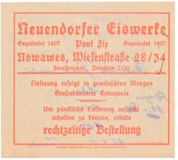 Text auf der Karte: Neuendorfer Eiswerke Paul Fix Entstehungszeit der Karte: 1948 Straße und Hausnummer: Wiesenstraße 28/34 Kartenart: Lieferschein Kartentechnik: Druck Verlag: unbekannt Gelaufen/ungelaufen: gelaufen Zustand (I=sehr gut bis V=mangelhaft): I Häufigkeit (h=häufig bis rrr=sehr selten): r Heutige(r) Straßenname(n): Wiesenstraße