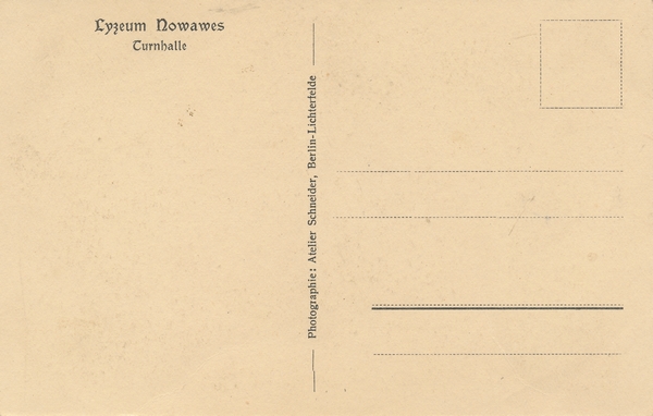 Text auf der Karte: Lyzeum Nowawes Turnhalle Entstehungszeit der Karte: ca. 1928 Straße und Hausnummer: Lindenstraße (Babelsberg) Kartenart: Ansichtskarte Kartentechnik: Kupfertiefdruck Verlag: Photographie: Atelier Schneider, Berlin-Lichterfelde Gelaufen/ungelaufen: ungelaufen Zustand (I=sehr gut bis V=mangelhaft): I Häufigkeit (h=häufig bis rrr=sehr selten): h Heutige(r) Straßenname(n): Rudolf-Breitscheid-Straße