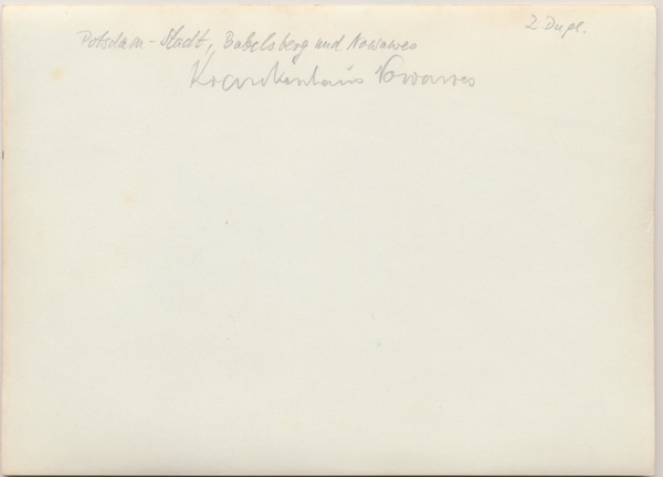 Text auf der Karte: Krankenhaus Nowawes Entstehungszeit der Karte: ca. 1915 Straße und Hausnummer: Lindenstraße (Babelsberg) Kartenart: Ansichtskartenvorlage 13x18 Kartentechnik: Sw-Foto Verlag: Max Hochgeladen, Potsdam Gelaufen/ungelaufen: ungelaufen Zustand (I=sehr gut bis V=mangelhaft): I Häufigkeit (h=häufig bis rrr=sehr selten): r Heutige(r) Straßenname(n): Rudolf-Breitscheid-Straße