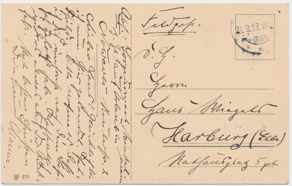 Text auf der Karte: Nowawes Yorck- u. Scharnhorststrasse Gemeindeschule III Realgymnasium Entstehungszeit der Karte: gestempelt 21.09.1917 Straße und Hausnummer: Scharnhorststraße Kartenart: Ansichtskarte Kartentechnik: SW-Litho Verlag: HP 370 Gelaufen/ungelaufen: Feldpost Zustand (I=sehr gut bis V=mangelhaft): I Häufigkeit (h=häufig bis rrr=sehr selten): r Heutige(r) Straßenname(n): Stephensonstraße Kommentar: Der in der Scharnhorststraße 1 als Realgymnasium konzipierte und in den Jahren 1906/1907 errichtete Nowaweser "Schulpalast" genügte bereits kurze Zeit nach seiner Fertigstellung nicht mehr den modernen Ansprüchen einer Höheren Schule und beherbergte daraufhin künftig die Gemeindeschulen II und IV. Heute befindet sich dort die Goethe-Grundschule. (Quelle: Potsdam-Museum (Herausgeber) Neuendorf - Nowawes - Babelsberg auf historischen Ansichtskarten, Potsdam 2004, Seite 77)