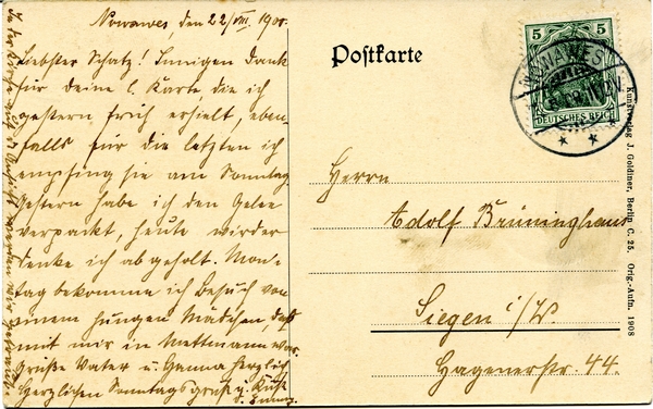 Text auf der Karte: Nowawes Entstehungszeit der Karte: gestempelt 22.08.1908 Kartenart: Ansichtskarte Kartentechnik: SW-Litho Verlag: Kunstverlag J. Goldiner, Berlin C. 25. Orig.-Aufn. 1908 Gelaufen/ungelaufen: gelaufen Zustand (I=sehr gut bis V=mangelhaft): II Häufigkeit (h=häufig bis rrr=sehr selten): h Kommentar: Blick über die Friedrichstraße auf das Gelände des Oberlinhauses, zu dessen besonderen Verdiensten auch der Aufbau der Hilfe für körperbehinderte und taubblinde Menschen im damaligen Preußen gehörte. (Quelle: Potsdam-Museum (Herausgeber) Neuendorf - Nowawes - Babelsberg auf historischen Ansichtskarten, Potsdam 2004, Seite 41)