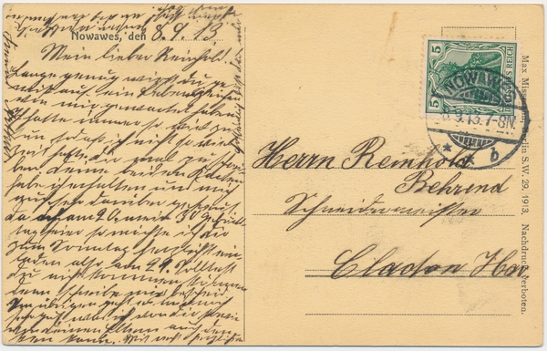 Text auf der Karte: Taubstummblindenheim zu Nowawes, Bez. Potsdam Entstehungszeit der Karte: gestempelt Nowawes 08.09.1913 Kartenart: Ansichtskarte Kartentechnik: SW-Litho Verlag: Max Missmann, Berlin S. W: 29. 1913. Gelaufen/ungelaufen: gelaufen Zustand (I=sehr gut bis V=mangelhaft): I Häufigkeit (h=häufig bis rrr=sehr selten): r Kommentar: Taubstummblinde Kinder aus dem deutschsprachigen Raum wurden, wenn das Geld dazu ausreichte, traditionell in das Oberlinhaus in Nowawes, einem Vorort von Potsdam gegeben. Seit 1887 wurden taubstummblinde Personen im dortigen Diakonissenmutterhaus soweit unterrichtet, dass sie bedingt erwerbstätig sein konnten. Ab Juli 1906 gab es in Nowawes das erste deutsche Taubstummenblindenheim nach schwedischem und amerikanischem Vorbild. (Quelle: Groschek, Iris Unterwegs in eine Welt des Verstehens, Hamburg 2008, Seite 276)