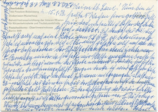 Kommentar: Taubstummblinde Kinder aus dem deutschsprachigen Raum wurden, wenn das Geld dazu ausreichte, traditionell in das Oberlinhaus in Nowawes, einem Vorort von Potsdam gegeben. Seit 1887 wurden taubstummblinde Personen im dortigen Diakonissenmutterhaus soweit unterrichtet, dass sie bedingt erwerbstätig sein konnten. Ab Juli 1906 gab es in Nowawes das erste deutsche Taubstummenblindenheim nach schwedischem und amerikanischem Vorbild.