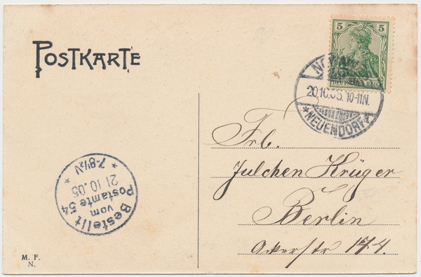 Text auf der Karte: Neuendorf Panorama Spiel- und Sportplatz Entstehungszeit der Karte: gestempelt Nowawes-Neuendorf 20.10.1905 Kartenart: Ansichtskarte Kartentechnik: SW-Litho Verlag: M. F. N. Gelaufen/ungelaufen: gelaufen Zustand (I=sehr gut bis V=mangelhaft): I Häufigkeit (h=häufig bis rrr=sehr selten): r Heutige(r) Straßenname(n): Karl-Liebknecht-Straße (Babelsberg-Nord) Lutherplatz Daimlerstraße Kommentar: Der Sportplatz befand sich direkt neben den Gleisen der Bahn zwischen Potsdam und Berlin. Die Bebauung im Hintergrund befindet sich an der östlichen Seite der Karl-Liebknechtstraße 1-3.
