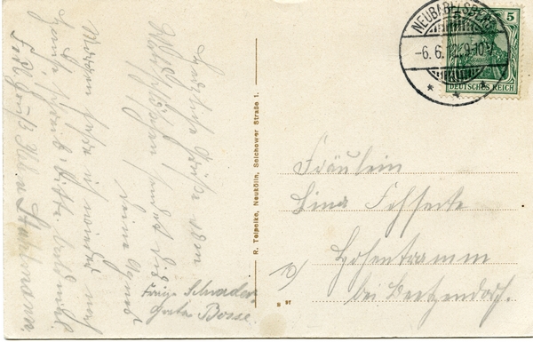 Text auf der Karte: Gruss aus dem Waldschlößchen Neubabelsberg b. Potsdam Inh. Oskar Rückert, Fernspr. A. Nowawes No. 104. Kaiser Wilhelm-Stiftung vom Waldschlößchen aus gesehen "Winter" (Künstlerkarte signiert Otto Thomasczek) Entstehungszeit der Karte: gestempelt Neubabelsberg 06.06.1912 Straße und Hausnummer: Stahnsdorferstraße 100 Kartenart: Ansichtskarte Kartentechnik: Rotations-Tiefdruck Verlag: R. Telpelke, Neukölln, Selchower Straße 1. Gelaufen/ungelaufen: gelaufen Zustand (I=sehr gut bis V=mangelhaft): I Häufigkeit (h=häufig bis rrr=sehr selten): r Heutige(r) Straßenname(n): Stahnsdorfer Straße Kommentar: Zu den traditionsreichen Neubabelsberger Restaurants gehörte das "Waldschlösschen" in der Stahnsdorfer Str. 100. (Quelle: Potsdam-Museum (Herausgeber) Neuendorf - Nowawes - Babelsberg auf historischen Ansichtskarten, Potsdam 2004, Seite 91)