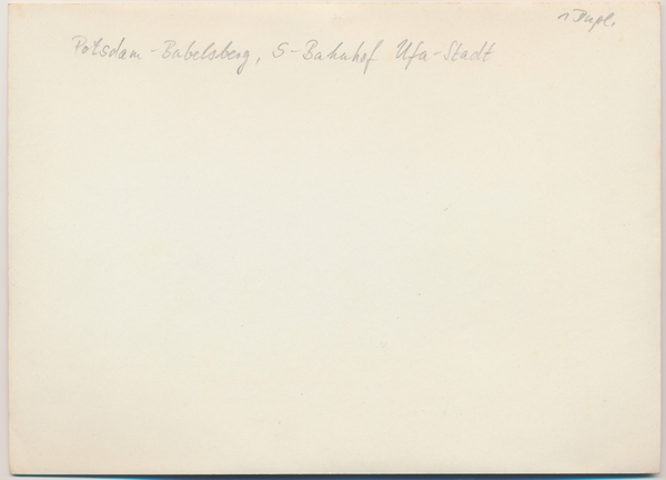 Text auf der Karte: Bahnhof Babelsberg Ufastadt. Entstehungszeit der Karte: ca. 1930 Straße und Hausnummer: Berliner Straße (Babelsberg) Kartenart: Ansichtskartenvorlage 13x18 Kartentechnik: SW-Foto Verlag: Max Hochgeladen, Potsdam Gelaufen/ungelaufen: ungelaufen Zustand (I=sehr gut bis V=mangelhaft): I Häufigkeit (h=häufig bis rrr=sehr selten): r Heutige(r) Straßenname(n): Rudolf-Breitscheid-Straße Kommentar: Der 1931 von Richard Brademann in rotem Klinker neu erbaute Bahnhof Neubabelsberg trug in den Jahren des Nationalsozialismus den Beinamen der nahe gelegenen "Traumfabrik" der "Universum Film AG": "Ufastadt". (Quelle: Potsdam-Museum (Herausgeber) Neuendorf - Nowawes - Babelsberg auf historischen Ansichtskarten, Potsdam 2004, Seite 93)