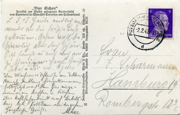 Text auf der Karte: "Vier Eichen", Albrechts-Teerofen Entstehungszeit der Karte: gestempelt Potsdam-Babelsberg 02.02.1942 Kartenart: Ansichtskarte Kartentechnik: SW-Foto Verlag: Industrie-Fotografen Klinke & Co., Berlin SW 68, Ritterstr. 23 Gelaufen/ungelaufen: gelaufen Zustand (I=sehr gut bis V=mangelhaft): I Häufigkeit (h=häufig bis rrr=sehr selten): h Heutige(r) Straßenname(n): Albrechts Teerofen