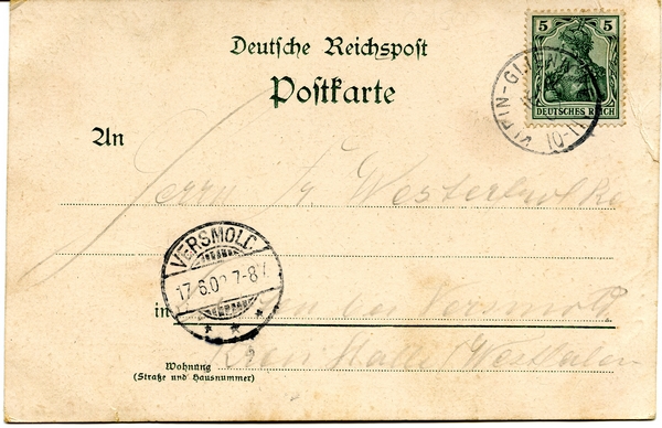Text auf der Karte: Gruss aus Kl. Glienicke. Bürgershof von Oscar Hering (überstempelt: Bürgershof Otto Buge) Entstehungszeit der Karte: gestempelt 16.06.1902 Straße und Hausnummer: Kurfürstenstraße (Klein-Glienicke) 4/5 Kartenart: Ansichtskarte Kartentechnik: Kol. Litho Verlag: Kunstverlag d. A.G. für Automatischen Verkauf, Berlin Gelaufen/ungelaufen: gelaufen Zustand (I=sehr gut bis V=mangelhaft): II Häufigkeit (h=häufig bis rrr=sehr selten): h Heutige(r) Straßenname(n): Waldmüllerstraße Kommentar: Im Jahre 1886 wurde das straßenseitige Hauptgebäude im Florentiner Renaissance-Stil von dem Potsdamer Hofbau- und Hofmaurermeister Friedrich Ernst Petzholtz (*1839 +1904) errichtet. 1971 erfolgte der Abriß.