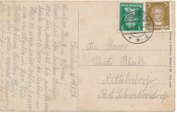Text auf der Karte: Klein-Glienicke bei Neu-Babelsberg Bürgershof Entstehungszeit der Karte: gestempelt Nowawes 15.08.1927 Straße und Hausnummer: Kurfürstenstraße (Klein-Glienicke) 4/5 Kartenart: Ansichtskarte Kartentechnik: SW-Litho Verlag: Kunstverlag J. Goldiner Berlin C. 25 Orig.-Aufn. Gelaufen/ungelaufen: gelaufen Zustand (I=sehr gut bis V=mangelhaft): I Häufigkeit (h=häufig bis rrr=sehr selten): h Heutige(r) Straßenname(n): Waldmüllerstraße Kommentar: Im Jahre 1886 wurde das straßenseitige Hauptgebäude im Florentiner Renaissance-Stil von dem Potsdamer Hofbau- und Hofmaurermeister Friedrich Ernst Petzholtz (*1839 +1904) errichtet. 1971 erfolgte der Abriß.