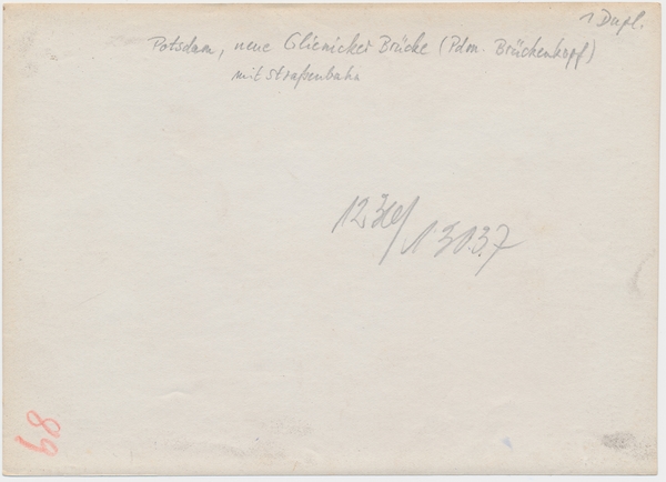 Text auf der Karte: Potsdam, Neue Glienicker Brücke. Entstehungszeit der Karte: ca. 1907 Straße und Hausnummer: Neue Königstraße Kartenart: Ansichtskartenvorlage 13x18 Kartentechnik: SW-Foto Verlag: Max Hochgeladen, Potsdam Gelaufen/ungelaufen: ungelaufen Zustand (I=sehr gut bis V=mangelhaft): I Häufigkeit (h=häufig bis rrr=sehr selten): rrr Heutige(r) Straßenname(n): Berliner Straße Glienicker Brücke Kommentar: Die neue Glienicker Brücke wurde am 15.06.1907 eingeweiht. (Quelle: Bohle-Heintzenberg, Sabine / Hamm, Manfred Die Berliner Vorstadt, Berlin 1995, Seite 15)
