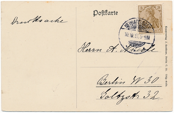 Text auf der Karte: Neubabelsberg Am Griebnitzsee Entstehungszeit der Karte: gestempelt Neubabelsberg 10.10.1913 Kartenart: Ansichtskarte Kartentechnik: SW-Litho Verlag: Kunstverlag J. Goldiner, Berlin C. 25. Orig.-Aufn. Gelaufen/ungelaufen: gelaufen Zustand (I=sehr gut bis V=mangelhaft): I Häufigkeit (h=häufig bis rrr=sehr selten): h