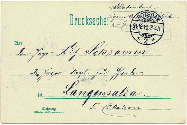 Text auf der Karte: Gruss aus der Kaserne des Leib-Garde-Husaren-Regiments Potsdam, Künstlerkarte sign. Karl Granck (5.6.[18]97) Entstehungszeit der Karte: gestempelt Potsdam 31.121910 Straße und Hausnummer: Neue Königstraße Kartenart: Ansichtskarte Kartentechnik: Farblitho Verlag: Kunstanstalt J. Miesler, Berlin S. Gelaufen/ungelaufen: gelaufen Zustand (I=sehr gut bis V=mangelhaft): I Häufigkeit (h=häufig bis rrr=sehr selten): r Heutige(r) Straßenname(n): Berliner Straße Kommentar: Die Kaserne an der Berliner Straße 27 wurde 1839 bis 1842 durch Johann Georg Carl Hampel unter Beteiligung von Karl Friedrich Schinkel und Ludwig Persius als lang gestreckter, sparsam gegliederter Komplex im "normannischen Stil" mit aufgesetztem Zinnenkranz erbaut. Die Eckrisalite wurden als gedrungene Wehrtürme gestaltet. Die Bauherren waren König Friedrich Wilhelm III. und König Friedrich Wilhelm IV. 1886/1887 erhielt die Kaserne eine eigene Offizierspeiseanstalt (Kasino). Die Kaserne wurde bis 1919 vom Leib-Garde-Husaren-Regiment, danach von der Reichswehr bzw. der Wehrmacht genutzt. Nach 1945 waren zunächst sowjetische Truppen, dann Einheiten der Nationalen Volksarmee in der Kaserne stationiert. Seit Ende 1990 befindet sich das Kreiswehrersatzamt der Bundeswehr in der Kaserne. Der zur Kaserne gehörige Komplex der Reitställe und Reitbahnen (1822 von Schinkel angelegt) ist durch den Bau der Zufahrt zur Haumboldt-Brücke weitgehend zerstört worden. Die erhaltenen Stallgebäude werden heute zivil genutzt. (Quelle: Wernicke, Thomas; Götzmann, Jutta; Winkler, Kurt (Herausgeber) Potsdam Lexikon Stadtgeschichte von A bis Z, Berlin, 2010, Seite 223)