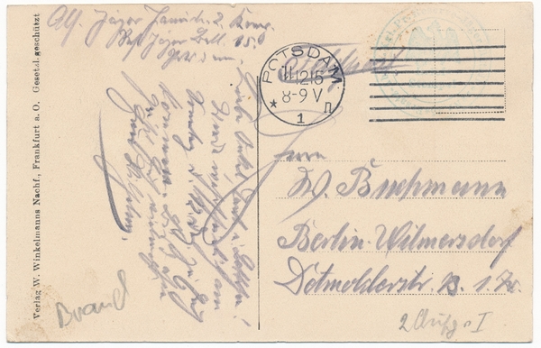 Text auf der Karte: Schipp Schipp Hurra! Bete und arbeite. (Künstlerkarte signiert m.l.) Entstehungszeit der Karte: gestempelt Potsdam 11.12.1915 Straße und Hausnummer: Elisabethstraße Kartenart: Ansichtskarte Kartentechnik: SW-Litho Verlag: Verlag W. Winkelmanns Nachf., Frankfurt a.O. gesetzl. Geschützt. Gelaufen/ungelaufen: gelaufen Zustand (I=sehr gut bis V=mangelhaft): II Häufigkeit (h=häufig bis rrr=sehr selten): h