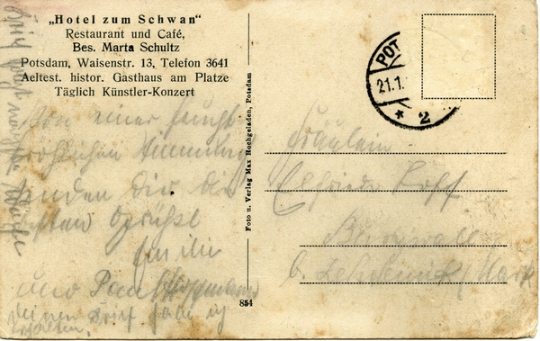 Text auf der Karte: Hotel zum Schwan Restaurant und Café Bes. Marta Schultz - Konzertzimmer Entstehungszeit der Karte: gestempelt Potsdam ca. 1925 Straße und Hausnummer: Waisenstraße (heute Dortustraße) 13 Kartenart: Ansichtskarte Kartentechnik: Kupfertiefdruck Verlag: 854 Foto u. Verlag Max Hochgeladen, Potsdam Gelaufen/ungelaufen: gelaufen Zustand (I=sehr gut bis V=mangelhaft): III Häufigkeit (h=häufig bis rrr=sehr selten): h Heutige(r) Straßenname(n): Dortustraße