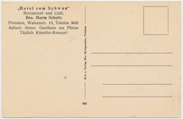 Text auf der Karte: Hotel zum Schwan Restaurant und Café Bes. Marta Schultz - Konzertzimmer Entstehungszeit der Karte: ca. 1925 Straße und Hausnummer: Waisenstraße (heute Dortustraße) 13 Kartenart: Ansichtskarte Kartentechnik: Kupfertiefdruck Verlag: 854 Foto u. Verlag Max Hochgeladen, Potsdam Gelaufen/ungelaufen: ungelaufen Zustand (I=sehr gut bis V=mangelhaft): I Häufigkeit (h=häufig bis rrr=sehr selten): h Heutige(r) Straßenname(n): Dortustraße