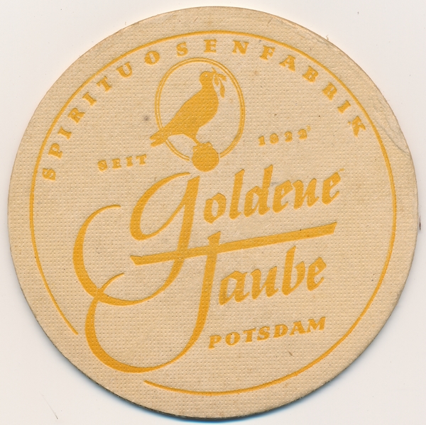 Text auf der Karte: Bierdeckel Spirituosenfabrik Goldene Taube seit 1822 Entstehungszeit der Karte: ca. 1930 Straße und Hausnummer: Jägerstraße 6 Kartenart: Bierdeckel Kartentechnik: Farbdruck Verlag: unbekannt Gelaufen/ungelaufen: ungelaufen Zustand (I=sehr gut bis V=mangelhaft): I Häufigkeit (h=häufig bis rrr=sehr selten): h Heutige(r) Straßenname(n): Jägerstraße (Potsdam-Stadt)