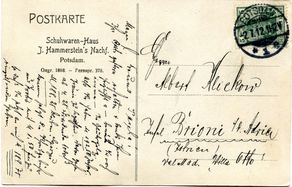 Text auf der Karte: Schuhwaren-Haus J. Hammerstein's Nachf. Potsdam. Gegr. 1868. - Fernspr. 378. Entstehungszeit der Karte: gestempelt 02.07.1912 Straße und Hausnummer: Brandenburger Straße 48 Kartenart: Ansichtskarte Kartentechnik: SW-Litho Verlag: unbekannt Gelaufen/ungelaufen: gelaufen Zustand (I=sehr gut bis V=mangelhaft): I Häufigkeit (h=häufig bis rrr=sehr selten): rr Heutige(r) Straßenname(n): Brandenburger Straße