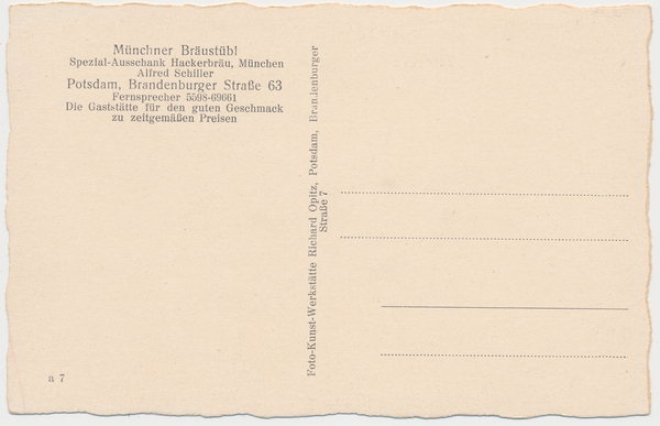 Text auf der Karte: Münchner Braustübl Spezial-Aussachank Hackerbräu, München Alfred Schiller, Potsdam, Brandenburger Str. 63 Entstehungszeit der Karte: ca. 1930 Straße und Hausnummer: Brandenburger Straße 63 Kartenart: Ansichtskarte Kartentechnik: SW-Foto Verlag: Foto-Kunst-Werkstätte Richard Optiz, Postdam, Brandenburger Str. 7 Gelaufen/ungelaufen: ungelaufen Zustand (I=sehr gut bis V=mangelhaft): I Häufigkeit (h=häufig bis rrr=sehr selten): r Heutige(r) Straßenname(n): Brandenburger Straße