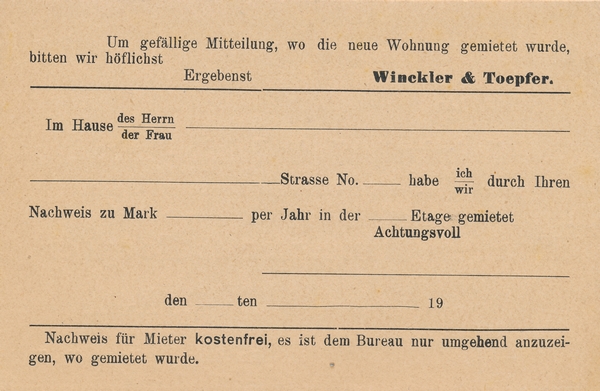 Text auf der Karte: An die Auskunftsstelle des Verkehrs-Vereins Wohnungs-Vermittlung und Auskunfts-Stelle des Vereins der Haus- und Grundbesitzer Herren Winckler & Toepfer Potsdam Brandenburger Str. No. 71. Entstehungszeit der Karte: vor 1905 Straße und Hausnummer: Brandenburger Straße 71 Kartenart: Geschäftskarte Kartentechnik: Druck Verlag: unbekannt Gelaufen/ungelaufen: ungelaufen Zustand (I=sehr gut bis V=mangelhaft): I Häufigkeit (h=häufig bis rrr=sehr selten): r Heutige(r) Straßenname(n): Brandenburger Straße