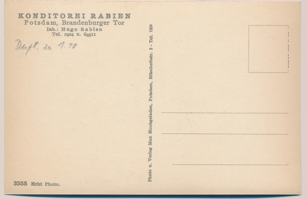 Text auf der Karte: Konditorei Rabien Entstehungszeit der Karte: ca. 1930 Straße und Hausnummer: Brandenburger Tor Kartenart: Ansichtskarte 9x14 Kartentechnik: SW-Foto Verlag: 3355 Photo u. Verlag Max Hochgeladen, Potsdam, Elisabethstr. 3 - Tel. 1804 Gelaufen/ungelaufen: ungelaufen Zustand (I=sehr gut bis V=mangelhaft): I Häufigkeit (h=häufig bis rrr=sehr selten): r Heutige(r) Straßenname(n): Brandenburger Tor Brandenburger Straße