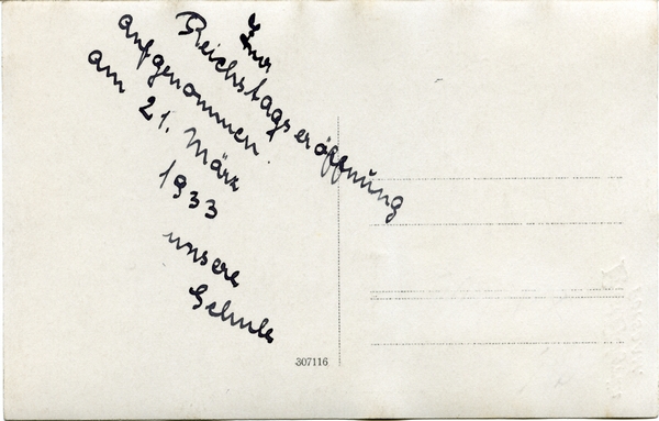 Text auf der Karte: Städtische Charlottenschule rückseitig vermerkt: Zur Reichstagseröffnung aufgenommen am 21. März 1933