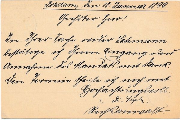 Text auf der Karte: Ganzsachenkarte Dr. Legeler, Rechtsanwalt & Notar, Potsdam, Fernsprech-Anschluss No. 386. Entstehungszeit der Karte: gestempelt Potsdam 24.01.1899 Straße und Hausnummer: Wilhelmplatz 6 Kartenart: Ganzsachenkarte Kartentechnik: Druck Verlag: unbekannt Gelaufen/ungelaufen: gelaufen Zustand (I=sehr gut bis V=mangelhaft): I Häufigkeit (h=häufig bis rrr=sehr selten): h Heutige(r) Straßenname(n): Platz der Einheit