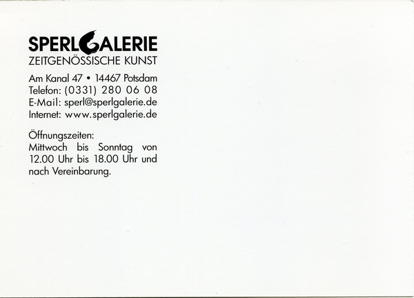 Text auf der Karte: SPERL GALERIE Zeitgenössische Kunst Entstehungszeit der Karte: 2010 Straße und Hausnummer: Am Kanal 47 Kartenart: Ansichtskarte Kartentechnik: Farbdruck Verlag: unbekannt Gelaufen/ungelaufen: ungelaufen Zustand (I=sehr gut bis V=mangelhaft): I Häufigkeit (h=häufig bis rrr=sehr selten): h Heutige(r) Straßenname(n): Am Kanal