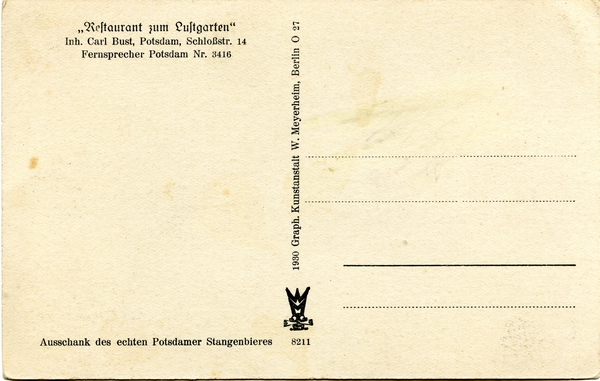 Text auf der Karte: Potsdam - "Restaurant zum Lustgarten" Garnisonkirche Inh. Carl Bust Entstehungszeit der Karte: ca. 1925 Straße und Hausnummer: Schloß-Straße 14 Kartenart: Ansichtskarte Kartentechnik: SW-Foto Verlag: 1930 Graph. Kunstanstalt W. Meyerheim, Berlin O 27 Gelaufen/ungelaufen: ungelaufen Zustand (I=sehr gut bis V=mangelhaft): I Häufigkeit (h=häufig bis rrr=sehr selten): h Heutige(r) Straßenname(n): Schloßstraße