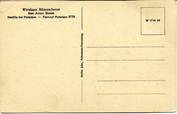 Text auf der Karte: Blick auf den Jungfernsee rückseitig: Wirtshaus Römerschanze Bes. Anton Bosek Nedlitz bei Potsdam - Fernruf Potsdam 3778