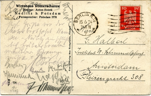 Text auf der Karte: Nedlitz Blick auf den Jungfernsee rückseitig: Wirtshaus Römerschanze Bes. Anton Bosek Nedlitz bei Potsdam - Fernsprecher: Potsdam 3778 Entstehungszeit der Karte: gestempelt 15.06.1924 Kartenart: Ansichtskarte Kartentechnik: SW-Litho Verlag: MHP 724 Foto u. Verlag Max Hochgeladen, Potsdam Gelaufen/ungelaufen: gelaufen Zustand (I=sehr gut bis V=mangelhaft): III Häufigkeit (h=häufig bis rrr=sehr selten): h