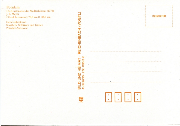 Text auf der Karte: Potsdam Die Gartenseite des Stadtschlosses (1773) J.F. Meyer Copyright Generaldirektion Schlösser und Gärten Potsdam-Sanssouci Entstehungszeit der Karte: ca. 1988 (Repro) Straße und Hausnummer: Alter Markt 1 Kartenart: Ansichtskarte Kartentechnik: Farb-Foto Verlag: Bild und Heimat . Reichenbach (Vogtl.) Gelaufen/ungelaufen: ungelaufen Zustand (I=sehr gut bis V=mangelhaft): I Häufigkeit (h=häufig bis rrr=sehr selten): h Heutige(r) Straßenname(n): Alter Markt