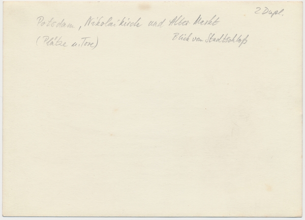 Text auf der Karte: Potsdam Blick vom Palast Barberini in Richtung Nikolaikirche Entstehungszeit der Karte: ca. 1925 Straße und Hausnummer: Alter Markt Kartenart: Ansichtskartenvorlage 13x18 Kartentechnik: SW-Foto Verlag: Max Hochgeladen, Potsdam Gelaufen/ungelaufen: ungelaufen Zustand (I=sehr gut bis V=mangelhaft): I Häufigkeit (h=häufig bis rrr=sehr selten): rrr Heutige(r) Straßenname(n): Am alten Markt