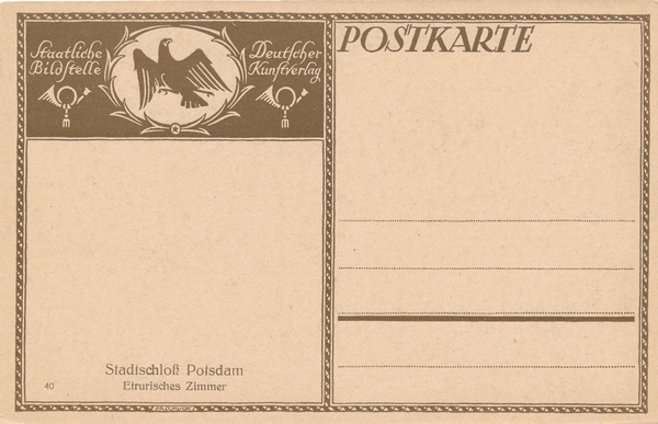 Text auf der Karte: Stadtschloß Potsdam Etrurisches Zimmer Entstehungszeit der Karte: ca. 1925 Straße und Hausnummer: Alter Markt 1 Kartenart: Ansichtskarte Kartentechnik: Kupfertiefdruck Verlag: Staatliche Bildstelle Deutscher Kunstverlag Gelaufen/ungelaufen: ungelaufen Zustand (I=sehr gut bis V=mangelhaft): I Häufigkeit (h=häufig bis rrr=sehr selten): h Heutige(r) Straßenname(n): Alter Markt