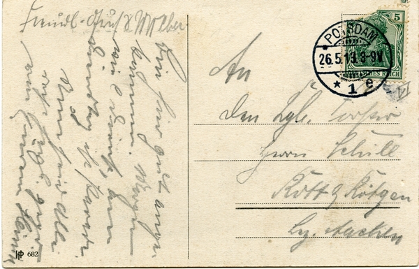 Text auf der Karte: Potsdam Eisenbahnhotel (Inh. Carl Wiechmann) Tel. 237 Anlegestelle der Sterndampfer Entstehungszeit der Karte: gestempelt Potsdam 26.05.1913 Kartenart: Ansichtskarte Kartentechnik: SW-Litho Verlag: HP 682 Gelaufen/ungelaufen: gelaufen Zustand (I=sehr gut bis V=mangelhaft): II Häufigkeit (h=häufig bis rrr=sehr selten): h