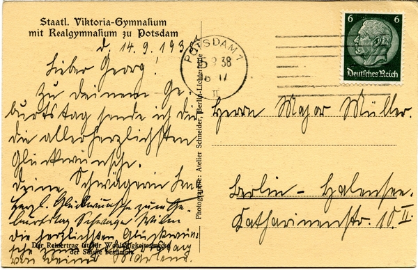 Text auf der Karte: Staatl. Viktoria-Gymnasium mit Realgymnasium zu Potsdam Ansicht von Südwesten Entstehungszeit der Karte: gestempelt 15.09.1938 Straße und Hausnummer: Kurfürstenstraße 53 Kartenart: Ansichtskarte Kartentechnik: SW-Foto Verlag: Photographie: Atelier Schneider, Berlin-Lichterfelde Gelaufen/ungelaufen: gelaufen Zustand (I=sehr gut bis V=mangelhaft): I Häufigkeit (h=häufig bis rrr=sehr selten): h Heutige(r) Straßenname(n): Kurfürstenstraße Kommentar: Rechts neben dem Nauener Tor in der Kurfürstenstraße befindet sich seit 1878 der rote Backsteinbau des Viktoria-Gymnasiums (heute: Helmholtz-Gymnasium). Die große Stadtschule in der Nauenerstraße wurde zu klein. (Quelle: Griep, Otto (Hrsg.) Potsdam in alten Ansichtskarten, Würzburg 1992, Seite 37)