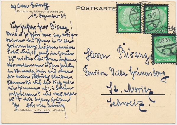 Text auf der Karte: Haus Albrechtstraße 26 (Architekten von Estorff & Winkler), siehe umseitig Autograph O. von Estorff Entstehungszeit der Karte: gestempelt Potsdam 20.12.1934 Straße und Hausnummer: Albrechtstraße 26 Kartenart: Ansichtskarte Kartentechnik: SW-Foto Verlag: unbekannt Gelaufen/ungelaufen: gelaufen Zustand (I=sehr gut bis V=mangelhaft): I Häufigkeit (h=häufig bis rrr=sehr selten): r Heutige(r) Straßenname(n): Am Neuen Garten