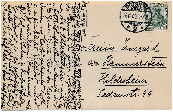 Text auf der Karte: Haus Am Neuen Garten 19 Entstehungszeit der Karte: gestempelt Potsdam 24.12.1909 Straße und Hausnummer: Albrechtstraße 19 Kartenart: Fotokarte Kartentechnik: SW-Foto Verlag: unbekannt Gelaufen/ungelaufen: gelaufen Zustand (I=sehr gut bis V=mangelhaft): III Häufigkeit (h=häufig bis rrr=sehr selten): r Heutige(r) Straßenname(n): Am Neuen Garten Kommentar: Das Gebäude Am Neuen Garten Nr. 19 wurde 1872 bis 1873 von F. A. Hasenheyer erbaut. (Mail Thomas Sander 19.05.2017)
