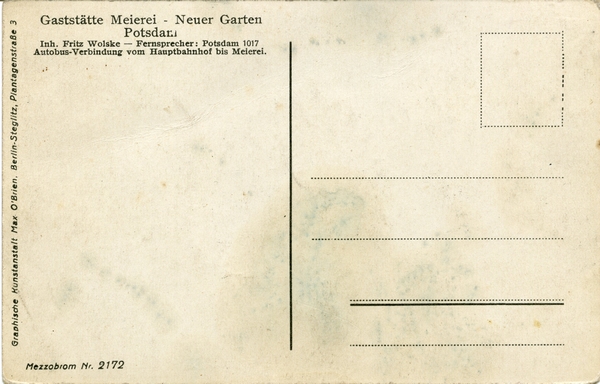 Text auf der Karte: Gaststätte Meierei - Neuer Garten Potsdam. Entstehungszeit der Karte: ca. 1930 Straße und Hausnummer: Neuer Garten Kartenart: Ansichtskarte Kartentechnik: SW-Foto Verlag: Graphische Kunstanstalt Max O'Brien, Berlin-Steglitz, Plantagenstrße 3 Gelaufen/ungelaufen: ungelaufen Zustand (I=sehr gut bis V=mangelhaft): I Häufigkeit (h=häufig bis rrr=sehr selten): h Heutige(r) Straßenname(n): Im Neuen Garten