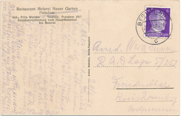 Text auf der Karte: Restaurant Meierei Innenansicht Rückseitig: Inh.: Fritz Wolske - Telefon: Potsdam 1017 Autobusverbindung vom Hauptbahnhof bis Meierei Entstehungszeit der Karte: gestempelt Berlin 20.09.1942 Straße und Hausnummer: Neuer Garten Kartenart: Ansichtskarte Kartentechnik: Kupfertiefdruck Verlag: Arthur Redecker, Berlin-Tempelhof. Gelaufen/ungelaufen: gelaufen Zustand (I=sehr gut bis V=mangelhaft): I Häufigkeit (h=häufig bis rrr=sehr selten): h Heutige(r) Straßenname(n): Im Neuen Garten