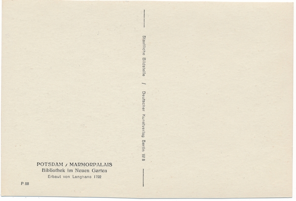 Text auf der Karte: Potsdam Bibliothek im Neuen Garten Erbaut von Langhans 1792