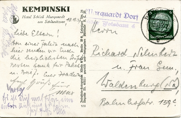 Text auf der Karte: Luftaufnahme Marquardt Rückseitig: KEMPINSKI Hotel Schloß Marquardt am Schlänitzsee Entstehungszeit der Karte: gestempelt 10.10.1937 Kartenart: Ansichtskarte Kartentechnik: SW-Foto Verlag: Klinke & Co. Berlin W. 8 Gelaufen/ungelaufen: gelaufen Zustand (I=sehr gut bis V=mangelhaft): I Häufigkeit (h=häufig bis rrr=sehr selten): h