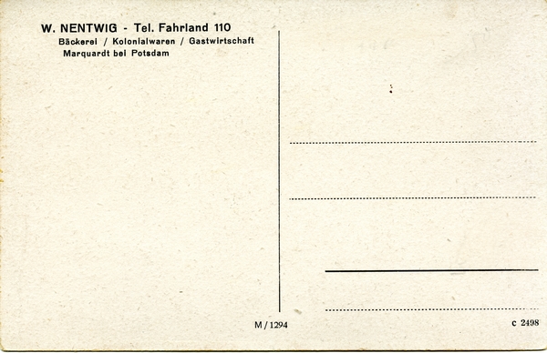 Text auf der Karte: Schloßpartie am Schlänitz See Marquardt bei Potsdam Rückseitig: W. Nentwig - Tel. Fahrland 110 Bäckerei/Kolonialwaren/Gastwirtschaft Marquardt bei Potsdam Entstehungszeit der Karte: ca. 1935 Kartenart: Ansichtskarte Kartentechnik: SW-Foto Verlag: M/1294 Gelaufen/ungelaufen: ungelaufen Zustand (I=sehr gut bis V=mangelhaft): I Häufigkeit (h=häufig bis rrr=sehr selten): h